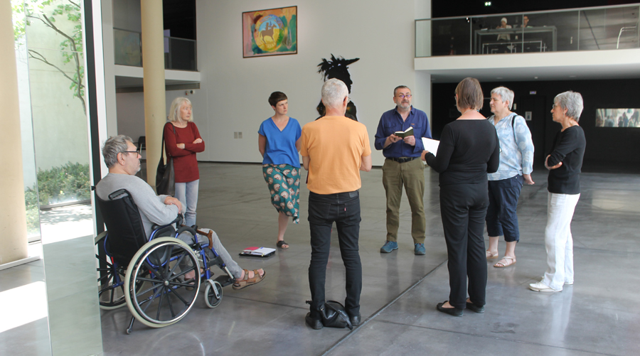 « Depuis le mois de septembre, nous relevons le défi d’écrire collectivement un livre et un journal de bord qui se construisent page à page. Chaque semaine, chaque page est manuscrite directement dans deux grands livres par toutes les personnes qui participent à ce laboratoire littéraire. Nous recherchons une cohérence dans l’écriture au fil de nos questionnements, de nos débats, de nos rencontres et de nos visites au MAC VAL. Nous partagerons avec vous notre démarche et nos écrits le temps d’une visite. »