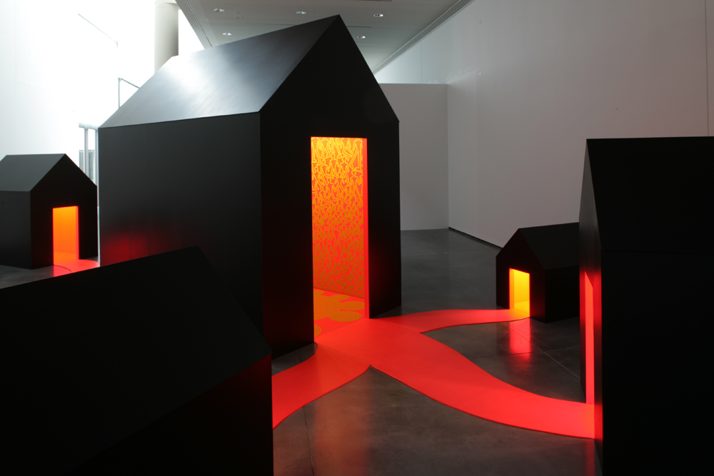 Un climat de forte tension est ainsi diffus dans l’installation Village et l’artiste parle même de « sauna visuel » pour caractériser cette expérience perturbante. La « maison mère », poumon de ce village, est reliée aux six autres maisons plus petites par des chemins, de larges aplats rouges en vinyl tels des vaisseaux sanguins que le visiteur arpente. Une forte lumière émane des sept maisons, figurant ainsi l’idée du foyer. Ce réseau évoque aussi les contes comme Hansel et Gretel, Le Petit Chaperon rouge. Il peut ainsi rappeler la vidéo Marsu (2003) où l’artiste a filmé sa propre fille déguisée en princesse. Par ses mimiques et les paroles d’une chanson qu’elle reprend en play-back, la petite fille de six ans exprime des émotions comme la colère, la rancœur.